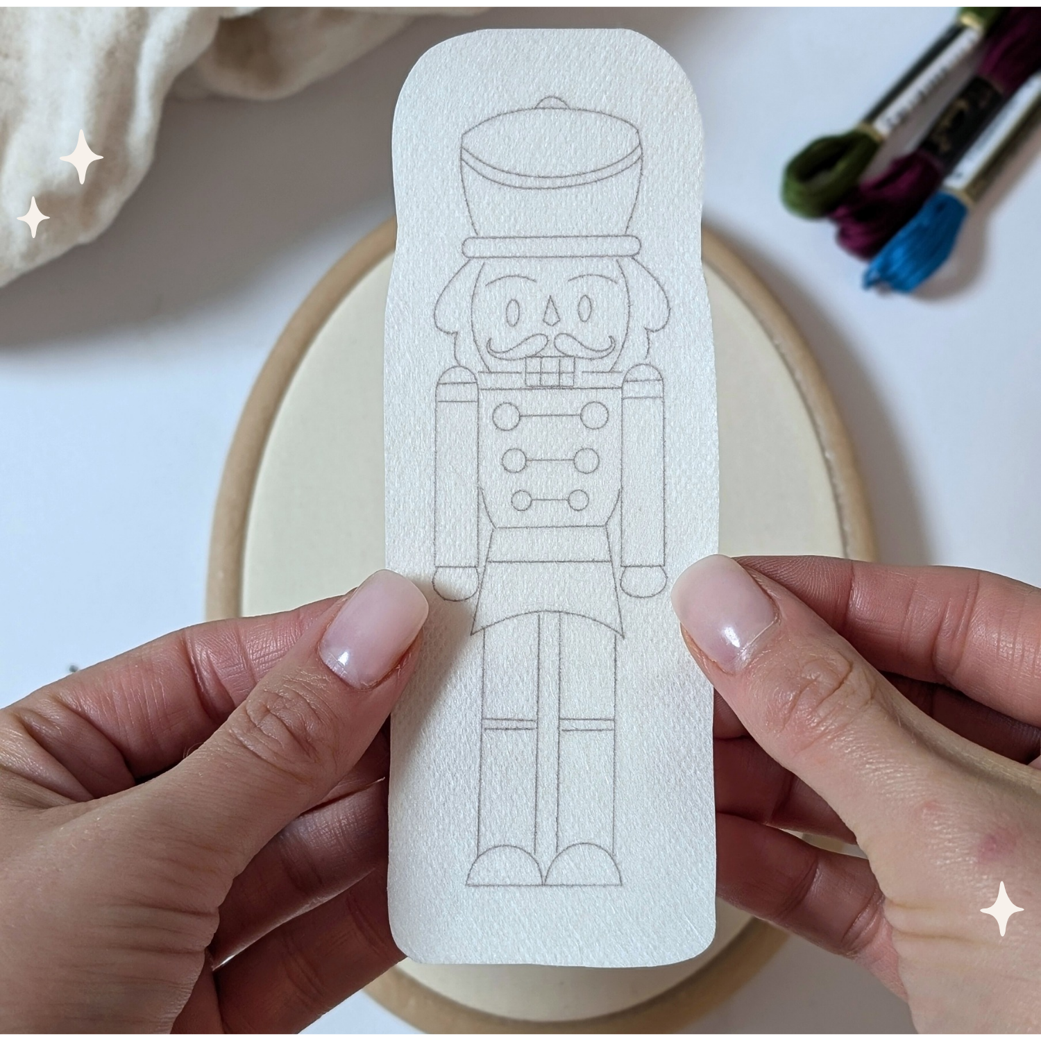 Du klebst den Sticker einfach auf deinen Stoff, stickst das Motiv nach und lässt ihn anschließend im Wasser verschwinden – übrig bleibt dein handgestickter Nussknacker, der dich mit jedem Blick an die stillen, kreativen Wintermomente erinnert.
