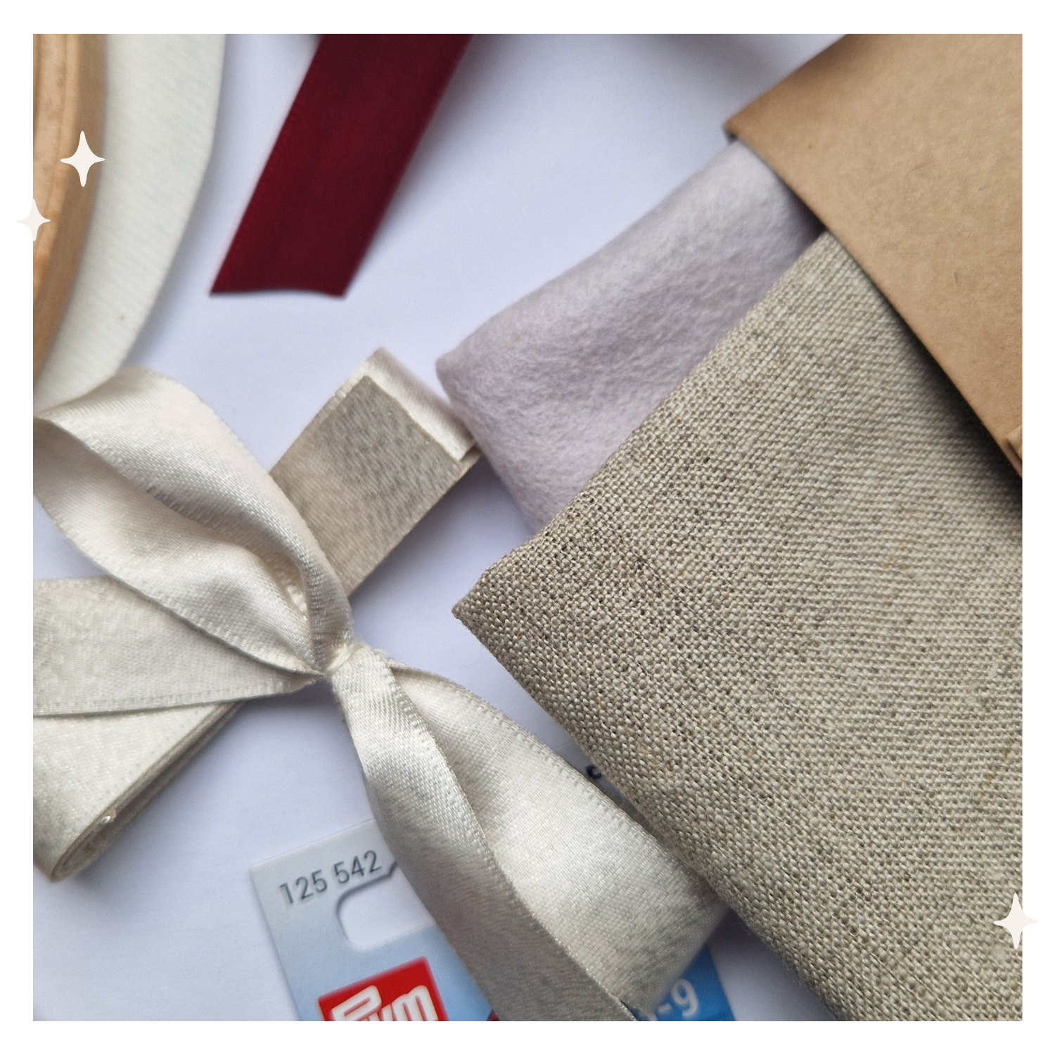 In der digitalen Anleitung sind alle nötigen Grundstiche enthalten und zudem wird jeder Schritt einzelnen in Bild, Text und Video erklärt. Ich erkläre die außerdem, wie du die Rückseite verkleidest und die Schleife anbringst.